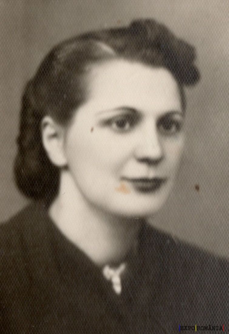 Imaginea prezintă un portret alb-negru al unei femei. Ea are părul închis la culoare, stilizat elegant și prins în spate. Poartă o haină sau un sacou închis la culoare, la baza gâtului putând fi observat un detaliu decorativ. Privirea femeii este direcționată ușor spre dreapta, iar expresia feței este sobră și serioasă. Fundalul este simplu, fără detalii.