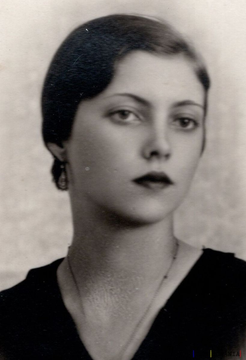 Imaginea prezintă un portret alb-negru al unei femei tinere. Aceasta are părul scurt, stilizat într-o coafură tipică pentru perioada interbelică. Femeia poartă o bluză sau rochie neagră simplă și un colier fin la gât. În urechea vizibilă se poate observa un cercel mic. Privirea ei este directă, ușor melancolică, iar expresia feței este serioasă. Fundalul este simplu, nedecorat, probabil pentru a pune în evidență trăsăturile feței subiectului.
