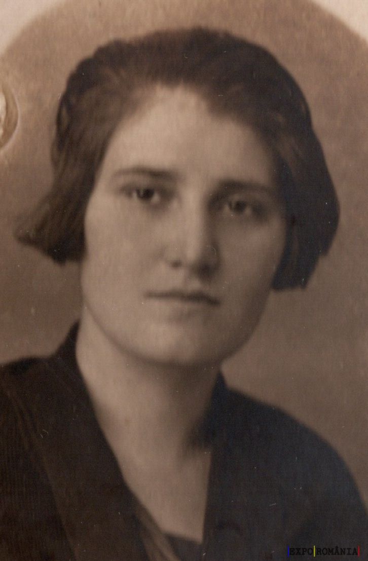 Imaginea este o fotografie alb-negru a unei femei cu părul scurt, de lungime medie, aranjat într-un stil clasic. Femeia poartă un obiect vestimentar de culoare închisă și are o expresie serioasă și calmă pe chip. Fundalul fotografiei este simplu și fără detalii, punând în evidență figura centrală a femeii. Fotografia pare a fi realizată într-un stil de portret, specific perioadei de începutul sau mijlocul secolului XX.
