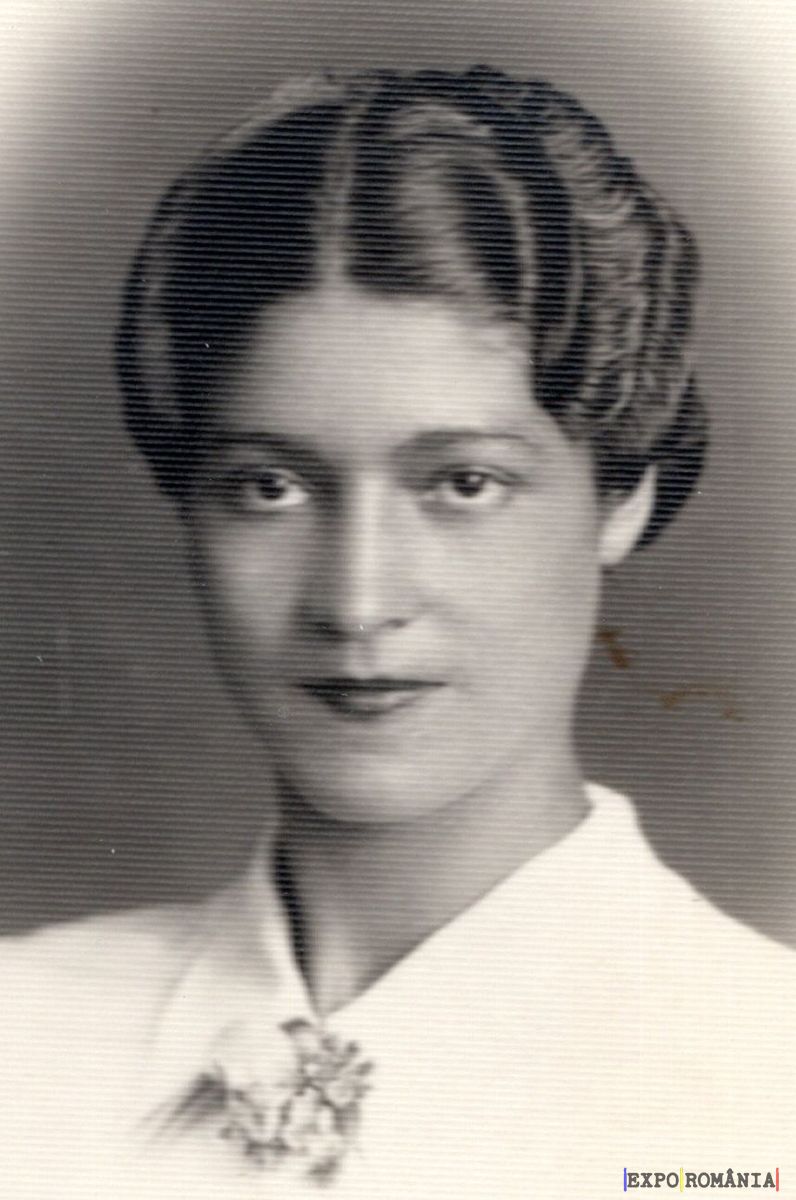În imagine este un portret alb-negru al unei femei tinere. Aceasta are părul aranjat într-un stil specific perioadei interbelice, cu bucle strânse și o cărare pe mijloc. Femeia poartă o bluză albă, simplă, decorată cu o broșă sau un ac de cravată în formă de floare. Privirea sa este îndreptată direct către aparat, iar expresia feței este calmă și serioasă. Fundalul este neutru, punând în evidență trăsăturile personajului principal.