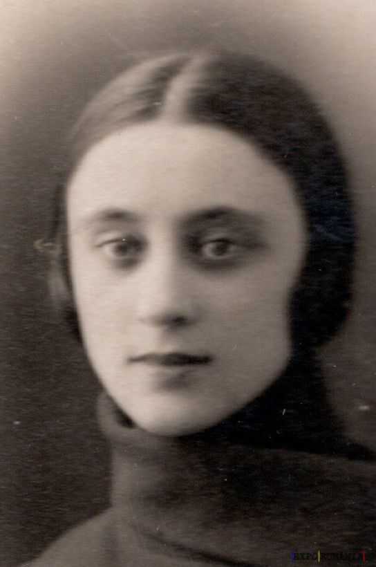 Imaginea prezintă un portret alb-negru al unei femei tinere. Ea are părul închis la culoare, pieptănat pe spate și tras într-un mod elegant, cu o cărare pe mijloc. Fața sa este serioasă și calmă, iar ochii sunt ușor accentuați. Femeia poartă un guler înalt, sugerând o ținută simplă și modestă. Fundalul este simplu și neclar, punând în evidență trăsăturile feței și expresia personajului central.