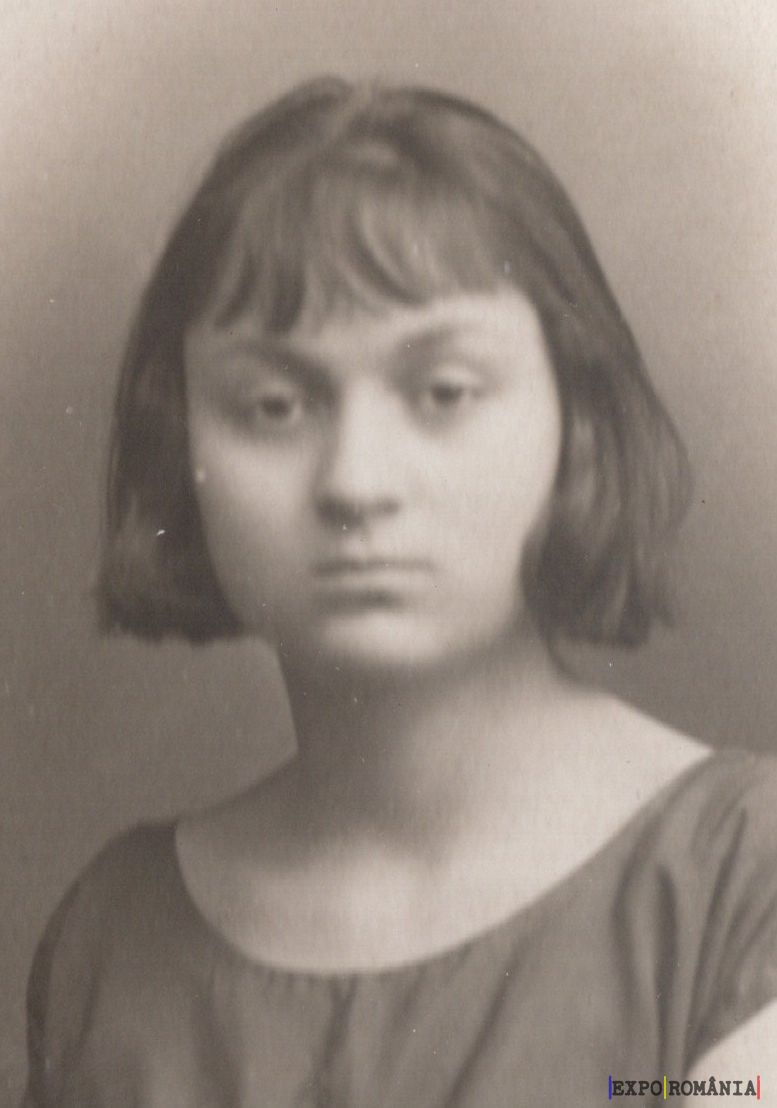 Imaginea prezintă o fotografie alb-negru a unei tinere. Aceasta are părul scurt, drept și închis la culoare, tuns într-un bob cu breton. Fața ei are o expresie neutră, iar umerii sunt ușor vizibili, sugerând că poartă o bluză simplă. Fundalul este simplu, fără detalii vizibile, punând accentul pe subiectul principal, tânăra din fotografie.