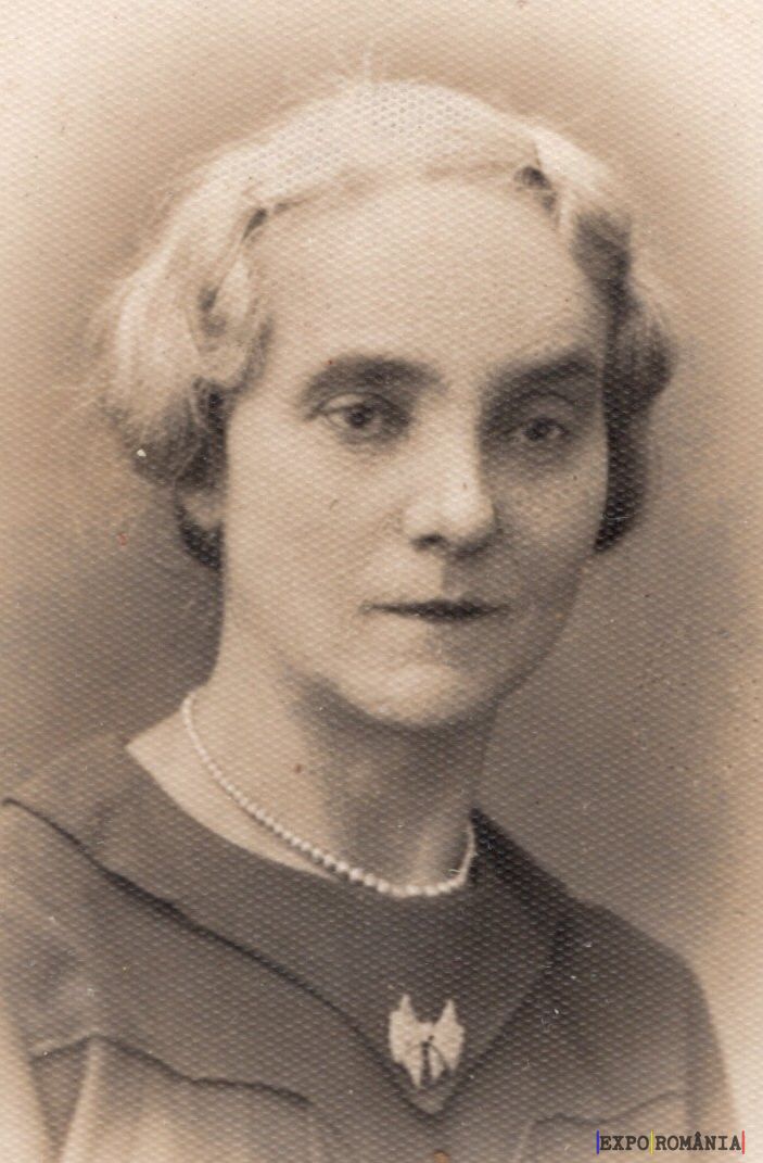 Imaginea prezintă o fotografie veche, monocromă, a unei femei. Ea are părul deschis la culoare, relativ scurt și ondulat. Femeia poartă un colier din perle și o rochie simplă, închisă la culoare, cu un guler ascuțit și broșă drept detaliu decorativ. Privirea ei este îndreptată direct către cameră, având o expresie serioasă. În fundal nu se observă alte detalii, fiind uniform și neclar. Fotografia are un aspect nostalgic, specific portretelor din începutul secolului XX.