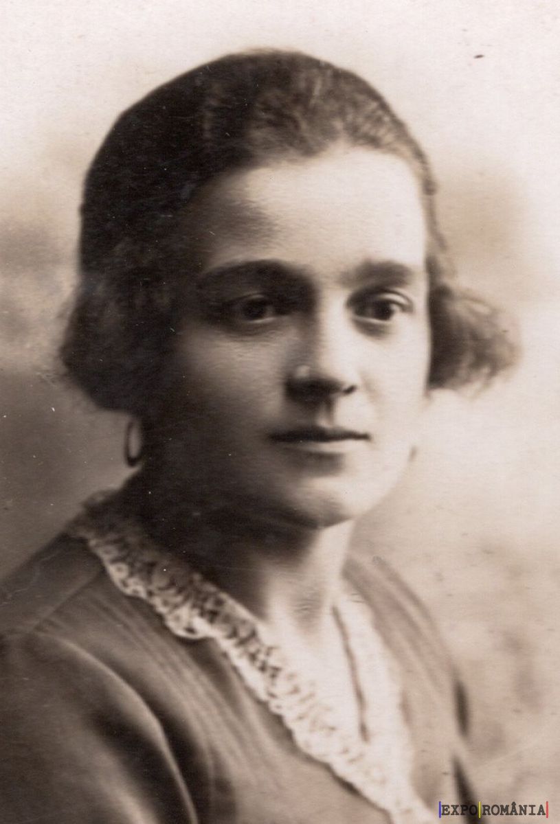 Imaginea prezintă o fotografie alb-negru a unei femei tinere. Ea are părul scurt și ondulat, și poartă o bluză cu guler decorat cu dantelă. Privirea ei este îndreptată spre cameră și are o expresie calmă și serioasă. Fundalul este neclar, punând accentul pe trăsăturile feței și ținuta femeii.