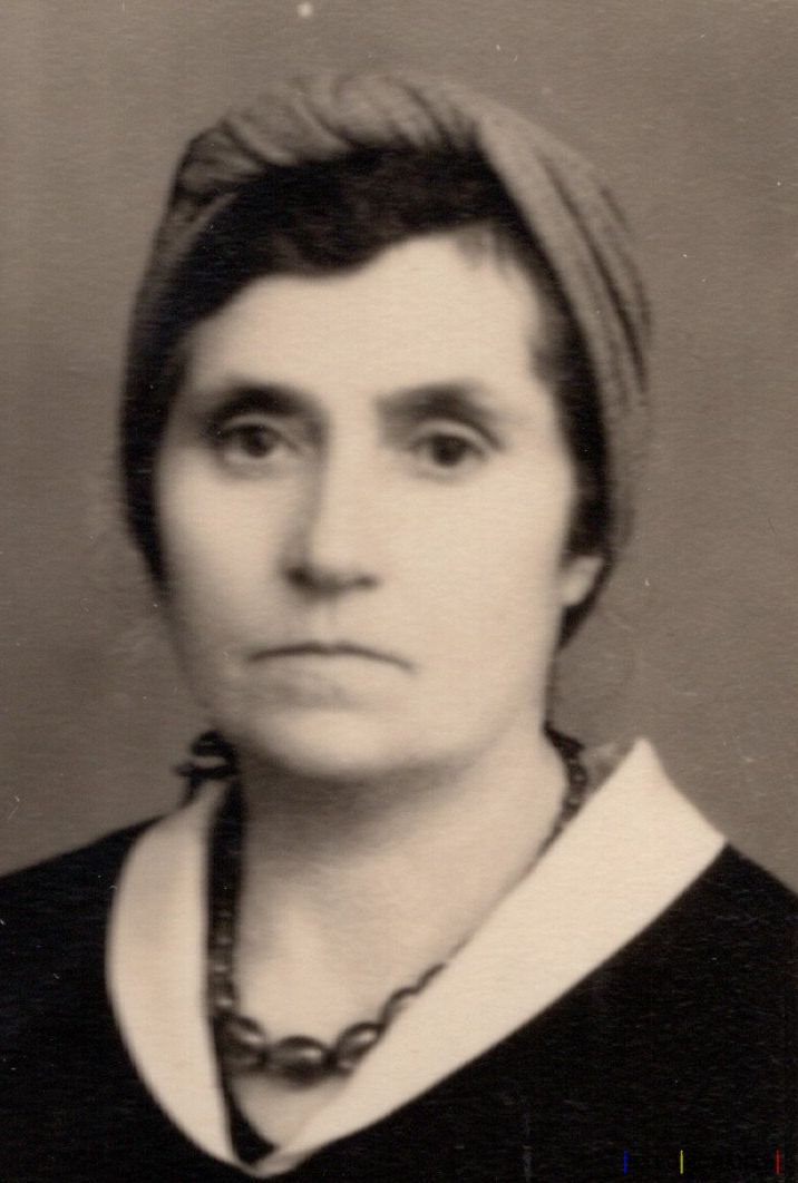 Imaginea prezintă portretul unei femei în vârstă, cu o expresie serioasă pe chip. Ea poartă o basma pe cap și un colier simplu la gât. Vestimentația sa pare a fi compusă dintr-o bluză cu guler alb. Fotografia este alb-negru și pare veche, sugerând că ar putea fi dintr-o perioadă mai demult.