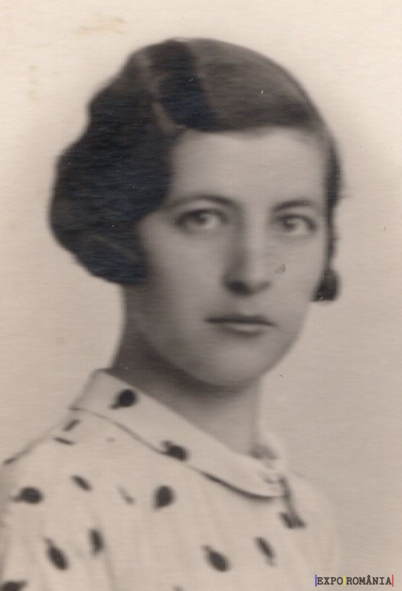 Fotografia prezintă o femeie tânără, cu părul închis la culoare, tuns scurt și coafat pe lângă cap. Ea poartă o bluză deschisă la culoare cu guler, decorată cu un model de puncte sau pete de culoare închisă. Expresia ei facială este calmă și serioasă, iar fotografia este alb-negru, sugerând că ar putea fi dintr-o perioadă mai veche. Fundalul este simplu și neutru, focalizând atenția pe portretul femeii.