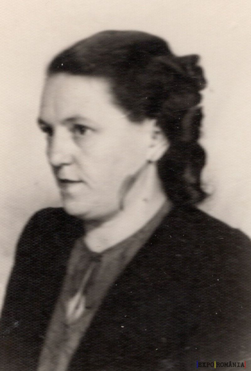 Imaginea alb-negru prezintă o femeie văzută din profil, privind spre stânga. Aceasta are părul închis la culoare, aranjat într-un mod elegant, legat la spate. Femeia poartă un sacou sau un blazer închis la culoare peste o haină deschisă la culoare. Fundalul este simplu și neclar, concentrând atenția asupra subiectului.