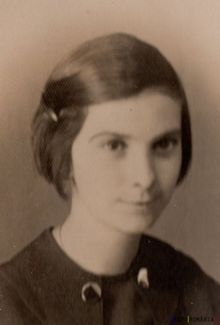 Imaginea prezintă un portret alb-negru al unei tinere. Are părul scurt și drept, prins cu o agrafă pe partea stângă a capului. Este îmbrăcată într-o bluză sau rochie simplă, închisă la culoare, cu un detaliu decorativ la guler. Privirea ei este îndreptată ușor spre cameră, exprimând o expresie calmă și serioasă. Fotografia pare să fie dintr-o perioadă anterioară, având un aspect retro sau vintage.