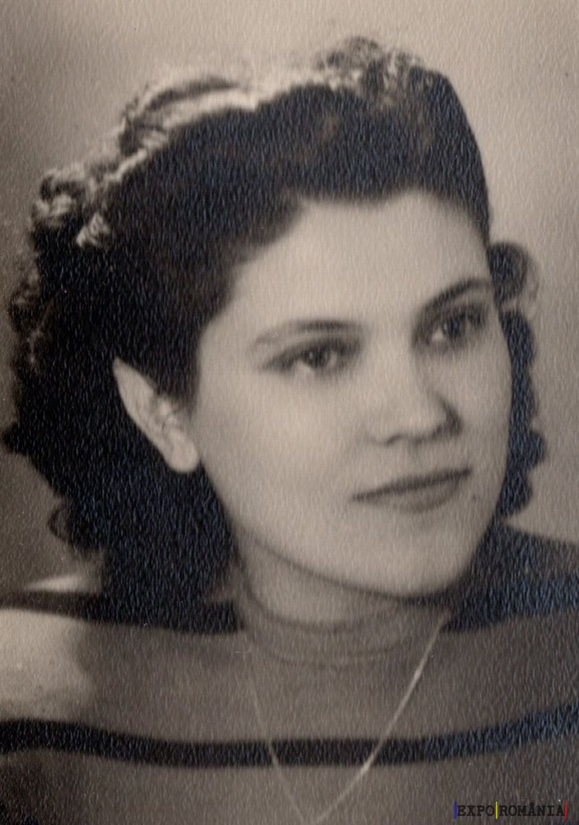 Imaginea prezintă un portret alb-negru al unei femei tinere, cu părul ondulat, coafat într-un stil retro, specific anilor 1940-1950. Are o expresie calmă și contemplativă, privirea fiind îndreptată undeva în afara cadrului. Poartă un pulover cu guler înalt și o lănțișoară subțire în jurul gâtului. Fundalul este simplu, accentuând figura sa.