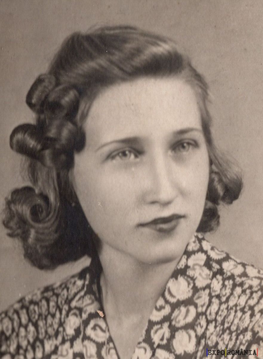 Imaginea este un portret alb-negru al unei femei tinere. Aceasta are părul coafat în bucle mari, amplasate simetric pe ambele părți ale feței. Poartă un ruj de o nuanță închisă și un top cu un model floral. Fundalul este simplu și neornamentat, focalizând atenția pe trăsăturile feței și coafura femeii.