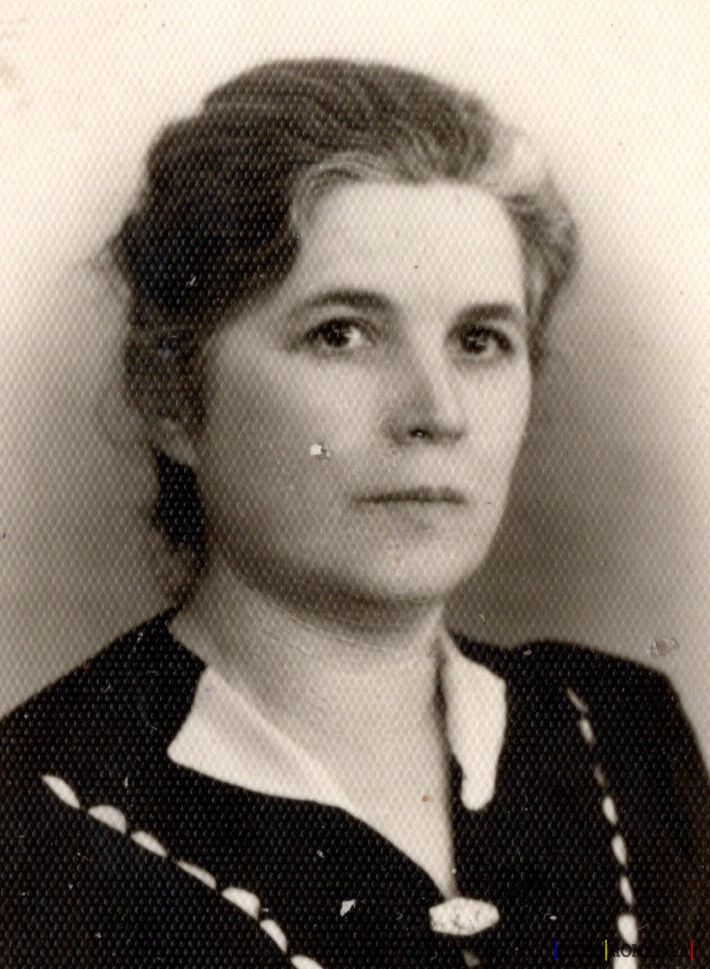 În imagine este portretul unei femei. Ea are părul prins la spate și fața ei este serioasă. Femeia poartă o bluză de culoare închisă cu un model simplu și guler alb. Fundalul este neutru, ceea ce ajută la focalizarea asupra trăsăturilor feței. Fotografia are un aspect alb-negru, sugerând că ar putea fi o imagine veche.