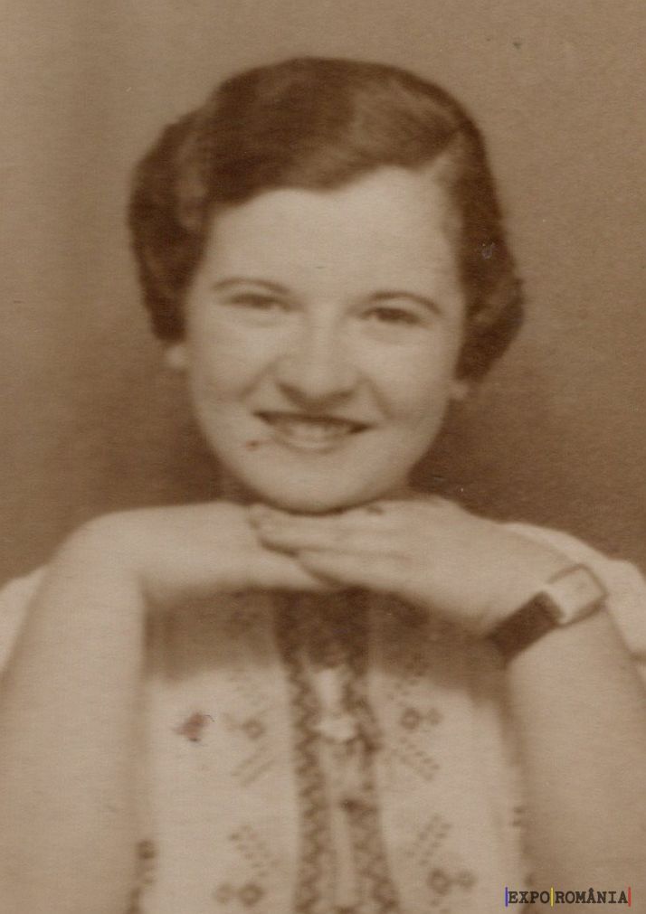 În imagine este prezentată o persoană de sex feminin purtând o bluză tradițională, decorată cu broderii. Persoana zâmbește ușor, sprijinindu-și bărbia pe mâini. Fotografia pare să fie una veche, alb-negru sau sepia, ceea ce sugerează un context istoric. Persoana poartă un ceas pe încheietura mâinii stângi, iar coafura este simplă și elegantă, caracteristică perioadelor anterioare. Fundalul fotografiei este simplu, fără elemente distincte care să atragă atenția.