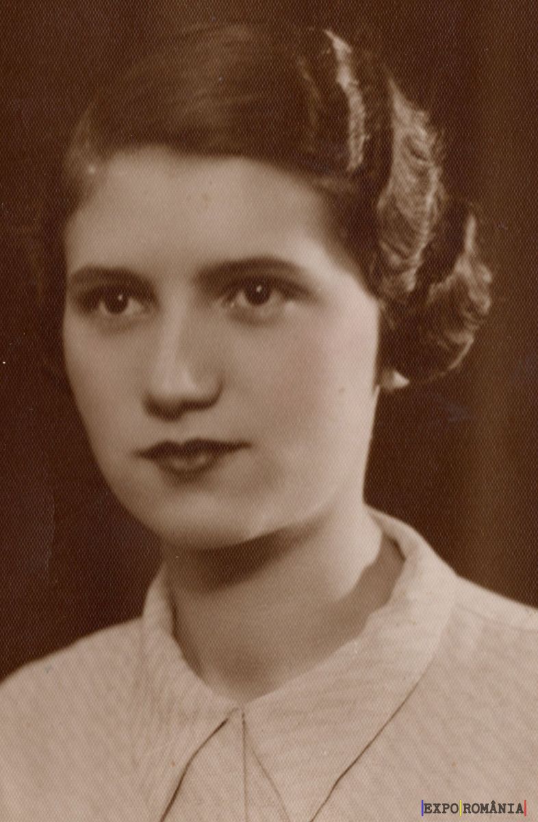 Este o fotografie vintage a unei femei tinere. Ea are părul scurt, coafat într-un stil clasic, ondulat și strâns pe laterale. Poartă o bluză deschisă la culoare, cu un guler simplu și pare să fie fotografiată pe un fundal simplu, închis la culoare. Expresia feței este calmă și serioasă, iar imaginea este clară, evidențiind trăsăturile feței sale.