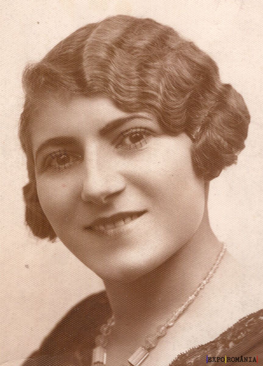 În imagine este o fotografie sepia, veche, a unei femei zâmbitoare cu păr ondulat, coafat în stil retro. Femeia poartă o rochie cu guler de dantelă și un colier simplu. Fundalul este simplu, permițând evidențierea persoanei în prim-plan.