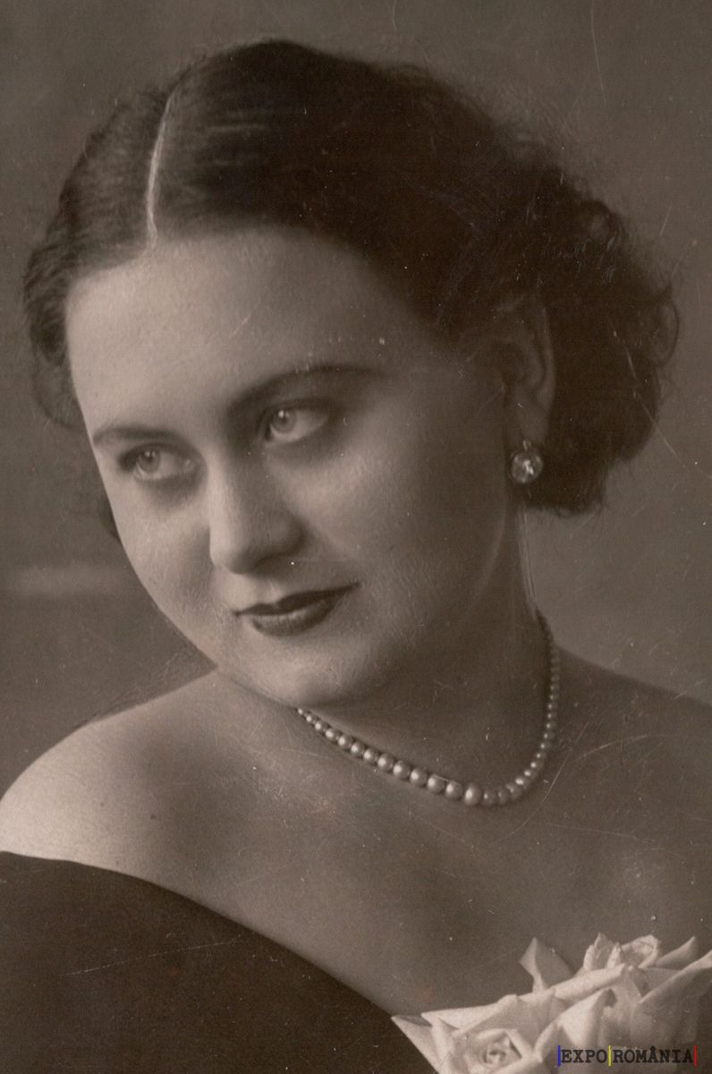 Imaginea prezintă un portret alb-negru al unei femei. Aceasta poartă o ținută elegantă, cu o rochie ușor decupată la umeri. La gât are un colier de perle și în urechi, cercei rotunzi strălucitori. Parul este coafat cu o cărare pe mijloc și prins la spate, conferindu-i un aspect rafinat și clasic. Privirea sa este ușor întoarsă într-o parte, având o expresie contemplativă și elegantă. Fotografia emană un aer de nostalgie și rafinament, specific stilului de portret din prima jumătate a secolului XX.