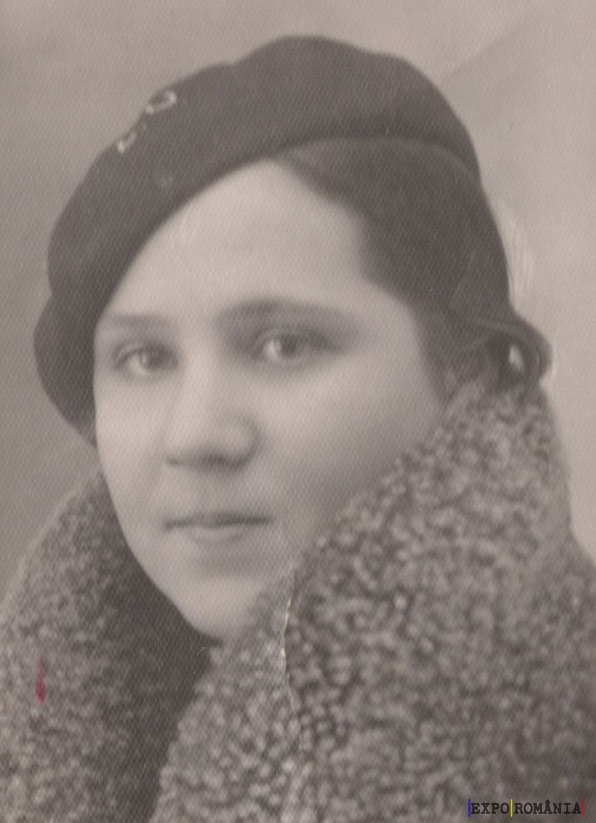 Imaginea prezintă un portret alb-negru al unei persoane de sex feminin. Aceasta poartă o pălărie neagră și o haină groasă, de iarnă, din material texturat. Persoana are părul scurt și toate trăsăturile feței, inclusiv ochii și gura, se disting clar. Fundalul este neutru, fără detalii semnificative. Fotografia pare a fi veche, având un aer nostalgic și clasic.