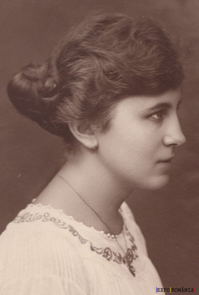 În imagine se află o femeie fotografiată din profil, îmbrăcată într-o bluză albă decorată cu broderii delicate în jurul gulerului. Ea are părul aranjat într-un coc elegant la spate. Fundalul este simplu și întunecat, scoțând în evidență figura femeii și conferindu-i o tentă clasică. Aspectul general sugerează o fotografie de epocă.