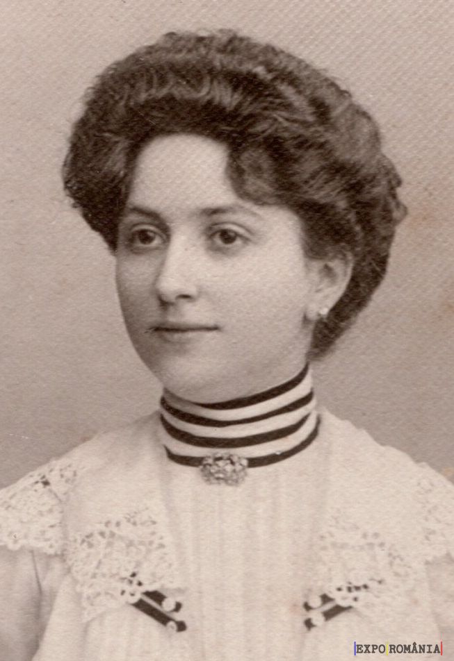 Aceasta este o fotografie veche, sepia, reprezentând o femeie tânără. Ea poartă o rochie decorată cu fronseuri și aplicații din dantelă. Gâtul îi este înconjurat de un guler înalt, cu dungi orizontale alb-negre, și o broșă decorativă este prinsă în față. Părul este coafat într-un stil voluminos și elegant, specific perioadei respective. Expresia feței este calmă și serioasă. Fundalul este simplu, punând accent pe subiectul fotografiei.