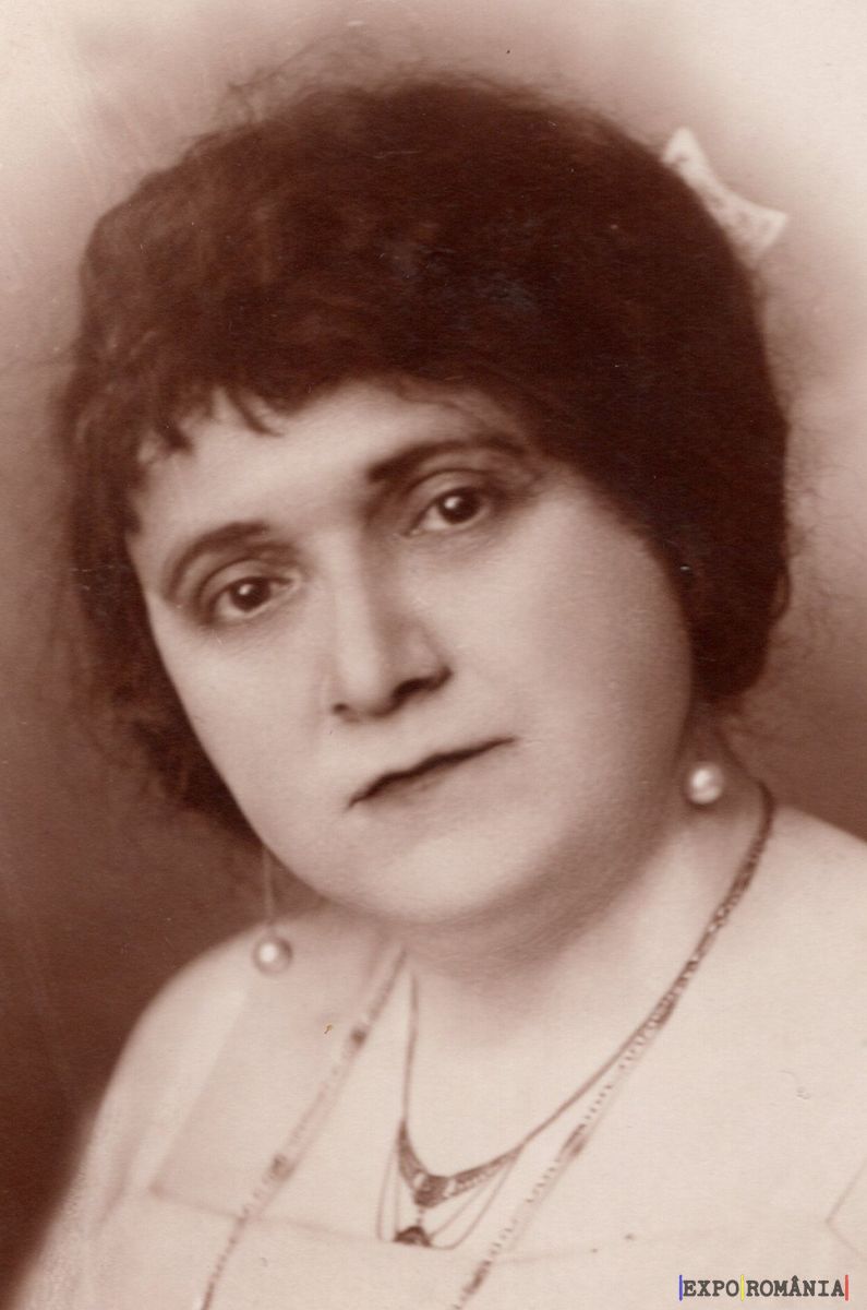 Imaginea prezintă un portret alb-negru al unei femei, realizat într-un stil fotografic de epocă. Femeia are părul scurt, ondulat și închis la culoare. Poartă cercei rotunzi și un colier simplu. Expresia sa este una calmă și contemplativă, cu o privire directă către obiectivul camerei. Fundalul este neclar, punând în evidență figura acesteia.