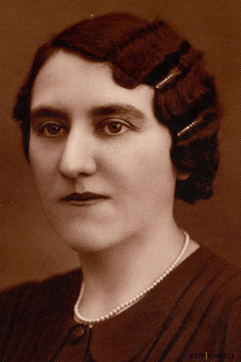 În imagine este un portret în sepia al unei femei. Ea are părul scurt, stilizat în onduleuri și prins cu agrafe, purtând o rochie de culoare închisă și un colier simplu de perle la gât. Expresia feței este sobră, iar privirea este concentrată. Imaginea emană o senzație de clasic și elegant, amintind de perioada începutului secolului al XX-lea.