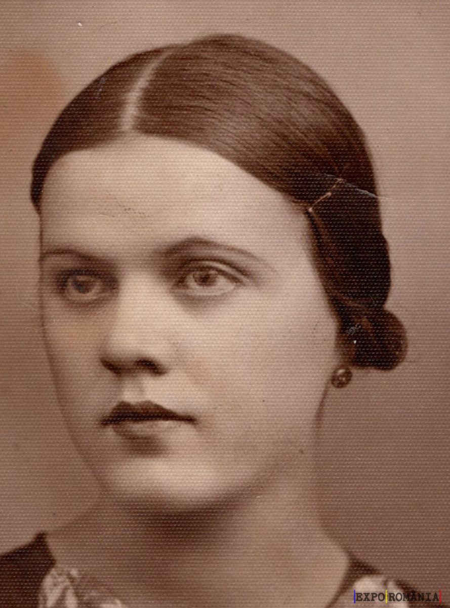 Imaginea prezintă un portret alb-negru al unei femei tinere. Aceasta are părul închis la culoare, pieptănat cu o cărare pe mijloc, și strâns la spate într-un mod elegant. Femeia are trăsături fine și ochi expresivi, iar pe lobul urechii poartă o pereche de cercei mici. Fundalul este simplu, fără detalii evidente, punând accentul pe figura subiectului.
