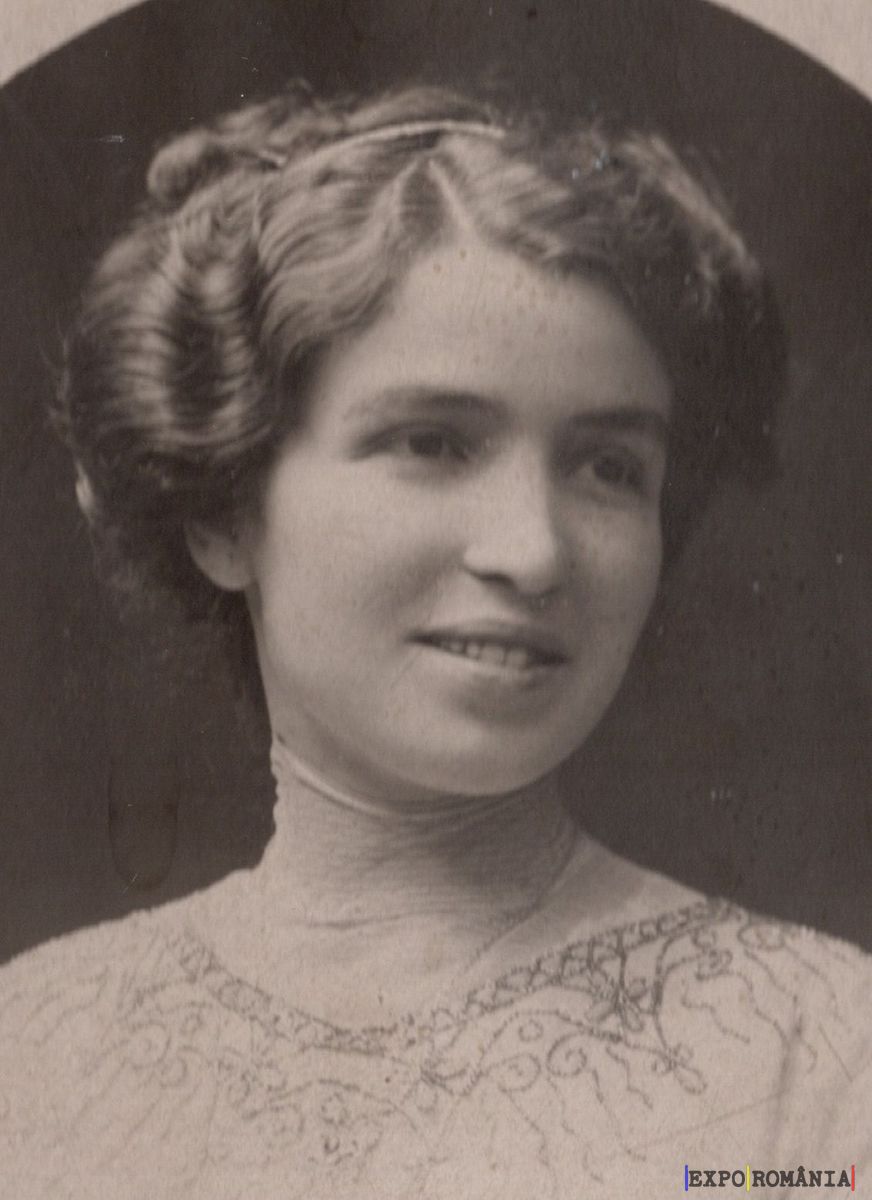 O fotografie alb-negru înfățișează o tânără femeie cu părul aranjat într-un stil elaborat, specific începutului de secol XX. Părul ei este ondulat și prins pe ambele părți ale capului. Ea poartă o bluză elegantă, cu un guler înalt, decorată cu modele intricate de broderie. Femeia zâmbește subtil și privește undeva în afara cadrului. Fundalul este neutru, punând accentul pe portretul subiectului.
