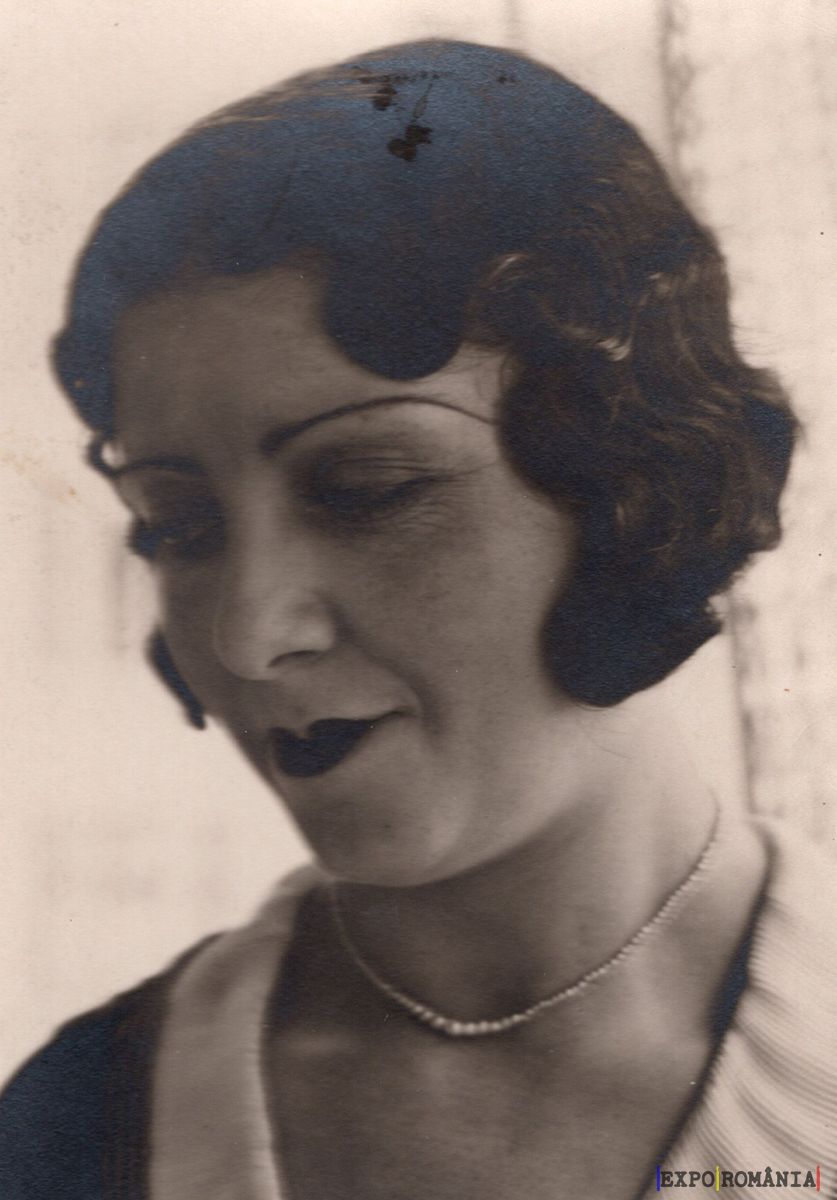 Imaginea prezintă portretul unei femei cu părul scurt, ondulat, stilizat într-un mod caracteristic perioadei anilor 1920-1930. Femeia poartă un colier delicat, iar expresia sa este una contemplativă, ușor melancolică. Fotografia este realizată în alb-negru, ceea ce subliniază estetica clasică și atemporală. Fundalul pare a fi neclar, punând în evidență trăsăturile persoanei din prim-plan.