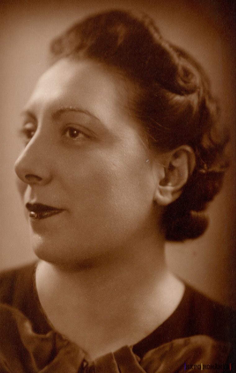 Imaginea prezintă un portret alb-negru al unei femei. Ea este fotografiată din profil, cu fața întoarsă ușor spre stânga. Femeia are părul ondulat și aranjat cu grijă, iar buzele sunt rujate. Ea poartă o bluză de culoare închisă, cu un guler distinct. Fundalul este simplu, punând în evidență trăsăturile feței. Atmosfera fotografiei sugerează o notă de eleganță și rafinament.
