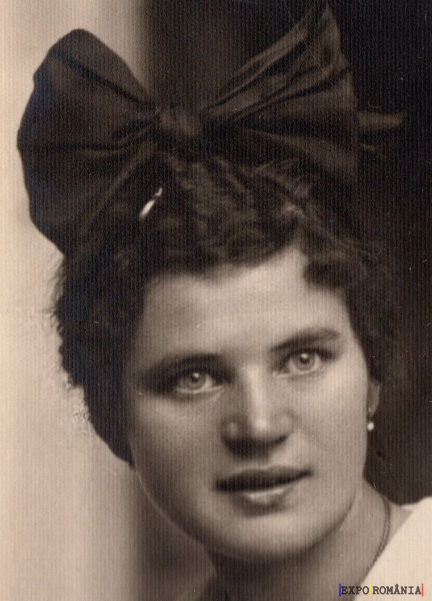 Imaginea prezintă o femeie tânără cu părul închis la culoare, stilizat într-un mod natural. Ea poartă o mare fundă neagră pe cap, care este un element proeminent în fotografie. Femeia are o privire expresivă și poartă cercei mici. Fundalul fotografiei este neclar, permițând focalizarea pe fața și accesoriile ei. Fotografia pare a fi una de epocă, sugerând un stil vestimentar și de coafură specific unei perioade anterioare.
