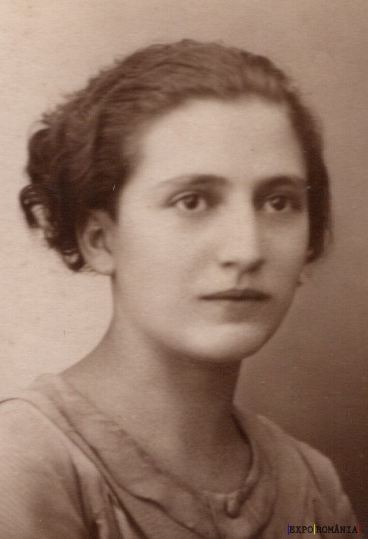Imaginea este un portret alb-negru al unei femei tinere. Aceasta are părul închis la culoare, prins la spate, și poartă o rochie simplă, deschisă la culoare. Privirea ei este îndreptată ușor către dreapta imaginii, iar expresia feței este serioasă și contemplativă. Fundalul este simplu, fără detalii specifice, permițându-i să fie în centrul atenției.