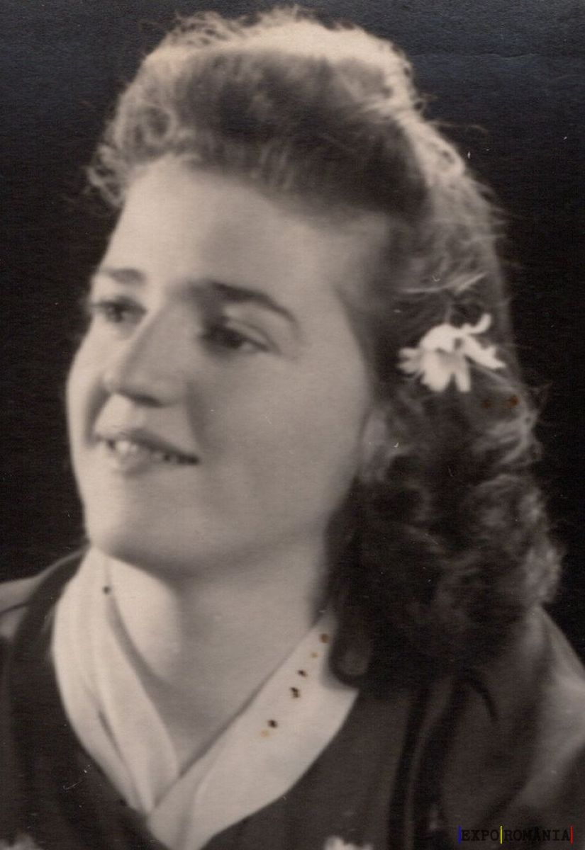 Imaginea prezintă o femeie tânără, zâmbind ușor, surprinsă într-un portret alb-negru. Părul este coafat în bucle și decorat cu o floare mică albă pe partea stângă. Purta o bluză sau o rochie cu guler alb și are o expresie senină și prietenoasă. Fundalul este întunecat, punând în prim-plan trăsăturile feței și părul.