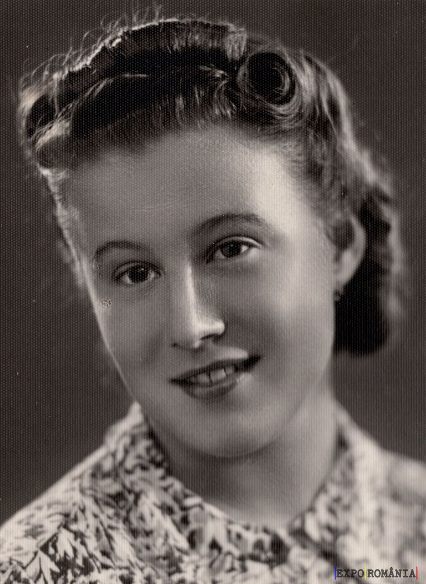 Imaginea prezintă un portret alb-negru al unei femei tinere. Aceasta are părul ondulat, prins parțial în sus, iar zâmbetul ei este cald și prietenos. Femeia poartă o bluză cu un model floral. Fundalul este simplu și neclar, concentrând atenția asupra trăsăturilor sale faciale și expresiei plăcute.