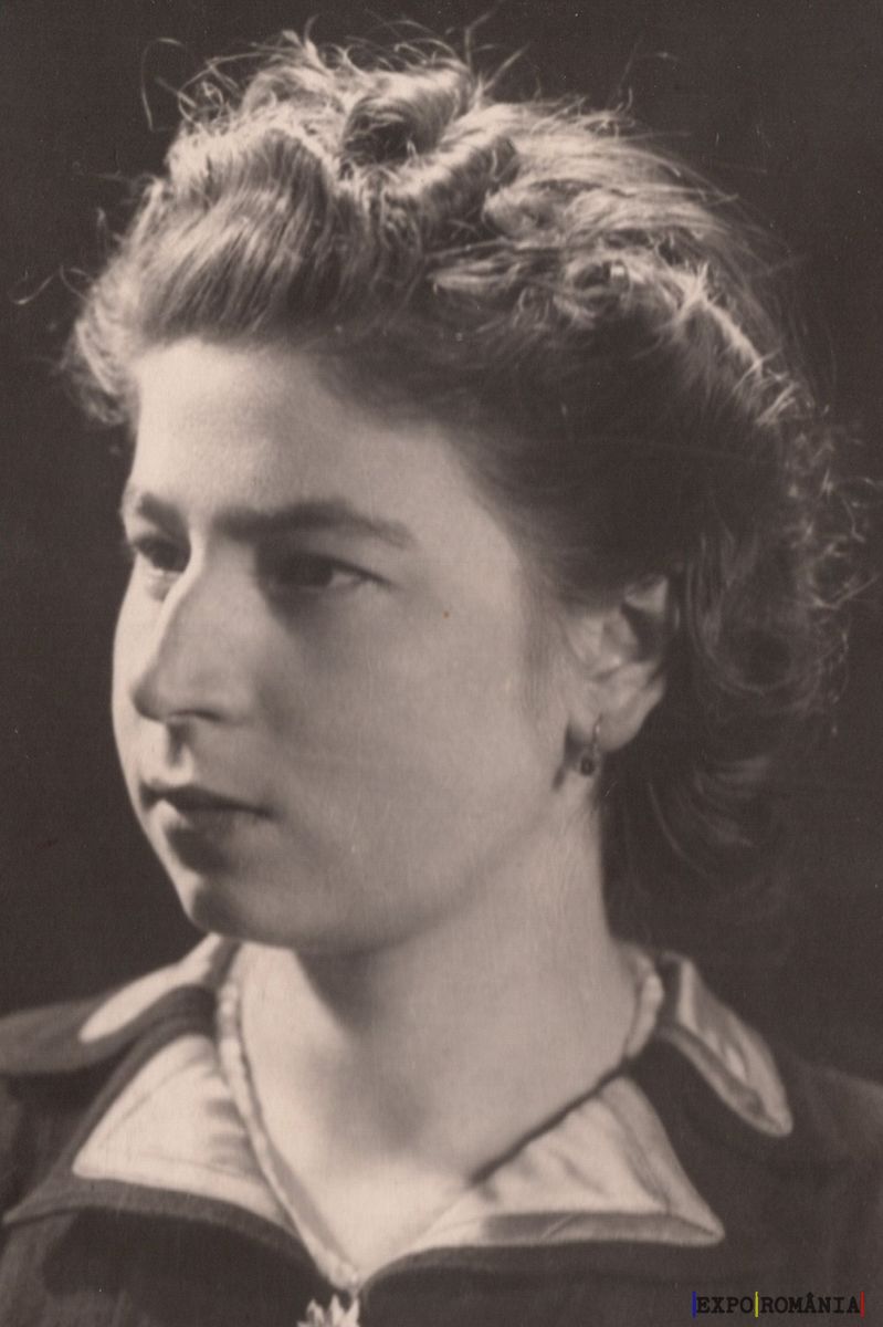 Imaginea prezintă un portret în alb-negru al unei femei tinere, realizat într-un stil clasic. Femeia este fotografiată din profil, cu fața orientată spre stânga. Are părul ondulat și prins într-un mod elegant, purtând un cercel simplu în urechea stângă. Poartă o bluză cu un guler alb, care este în contrast cu tonul mai închis al hainelor. Expresia feței este una calmă și serioasă. Lumina este direcționată astfel încât să scoată în evidență trăsăturile feței și textura părului.