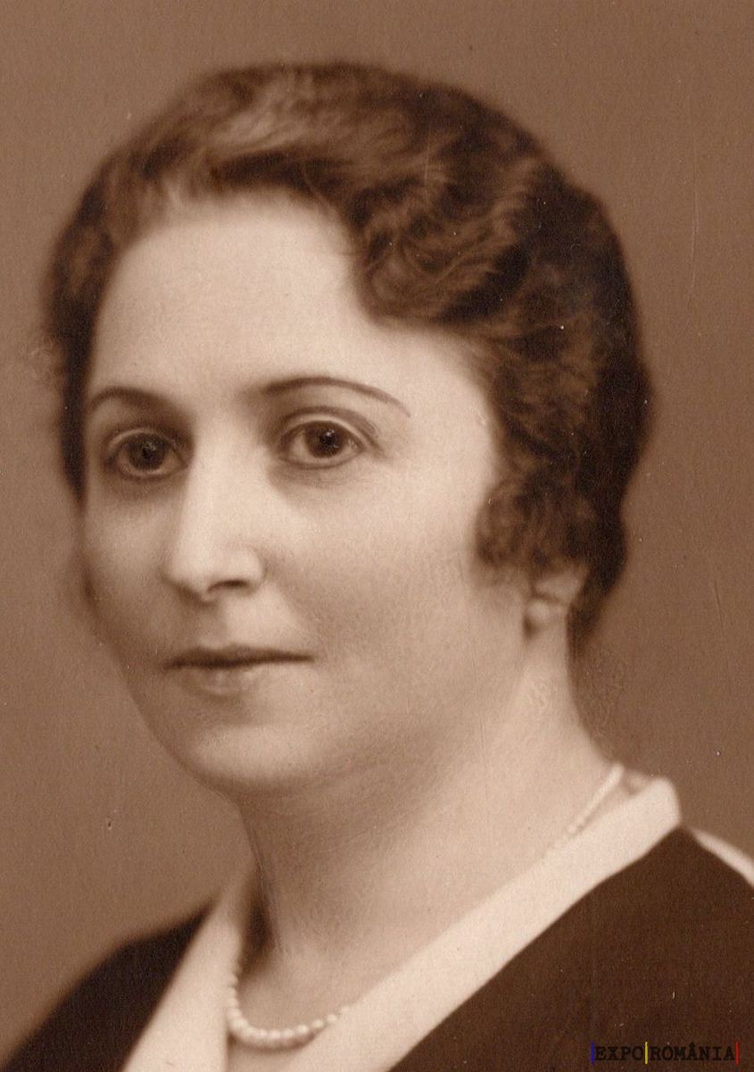 Imaginea prezintă un portret fotografic al unei femei. Aceasta are părul scurt și ondulat, cu cărare pe partea stângă. Poartă un colier de perle și o haină cu guler alb. Expresia feței sale este calmă și serioasă, iar fundalul este simplu și monocrom. Stilul general al portretului sugerează o fotografie de epocă.