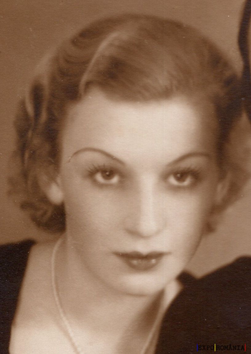 Imaginea prezintă portretul unei femei tinere cu părul deschis la culoare, coafat în bucle elegante. Are sprâncenele subțiri și arcuite, iar ochii mari și expresivi sunt accentuați de machiaj. Buzele sunt rujate într-o nuanță închisă. Femeia poartă o bluză sau o rochie de culoare închisă și un colier fin. Fotografia pare să fie alb-negru, sugerând că ar putea fi realizată într-o perioadă mai veche.