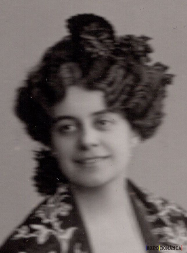 Imaginea prezintă portretul unei femei cu părul buclat, aranjat într-un stil elaborat și voluminos. Poartă o ținută decorată cu modele florale sau alte motive, adăugând un aer de eleganță. Fotografia pare a fi alb-negru și de epocă, sugerând că este posibil realizată în primele decenii ale secolului 20. Expresia femeii este destinsă, cu un zâmbet ușor pe buze, iar privirea sa este îndreptată ușor în lateral. Fundalul este simplu, punând accentul pe subiect.