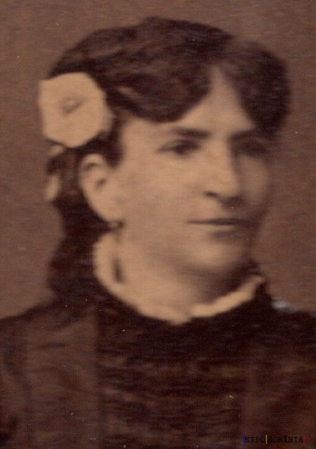 În imagine este portretul unei femei cu părul închis la culoare, prins la spate și decorat cu o floare albă mare, prinse pe o parte a capului. Aceasta poartă o ținută închisă la culoare, cu un guler alb decorativ la baza gâtului. Portretul are un aspect vechi, sugerând o fotografie de epocă. Fundalul este simplu și neclar, concentrând atenția asupra trăsăturilor feței și accesoriului floral.
