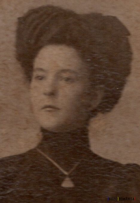 În imagine este portretul alb-negru al unei femei din perioada victoriană sau edwardiană. Ea poartă un colier cu pandantiv și o rochie cu guler înalt. Părul este aranjat într-un stil voluminos și sofisticat, specific începutului de secol XX. Imaginea are un aspect vechi, posibil o fotografie de epocă.