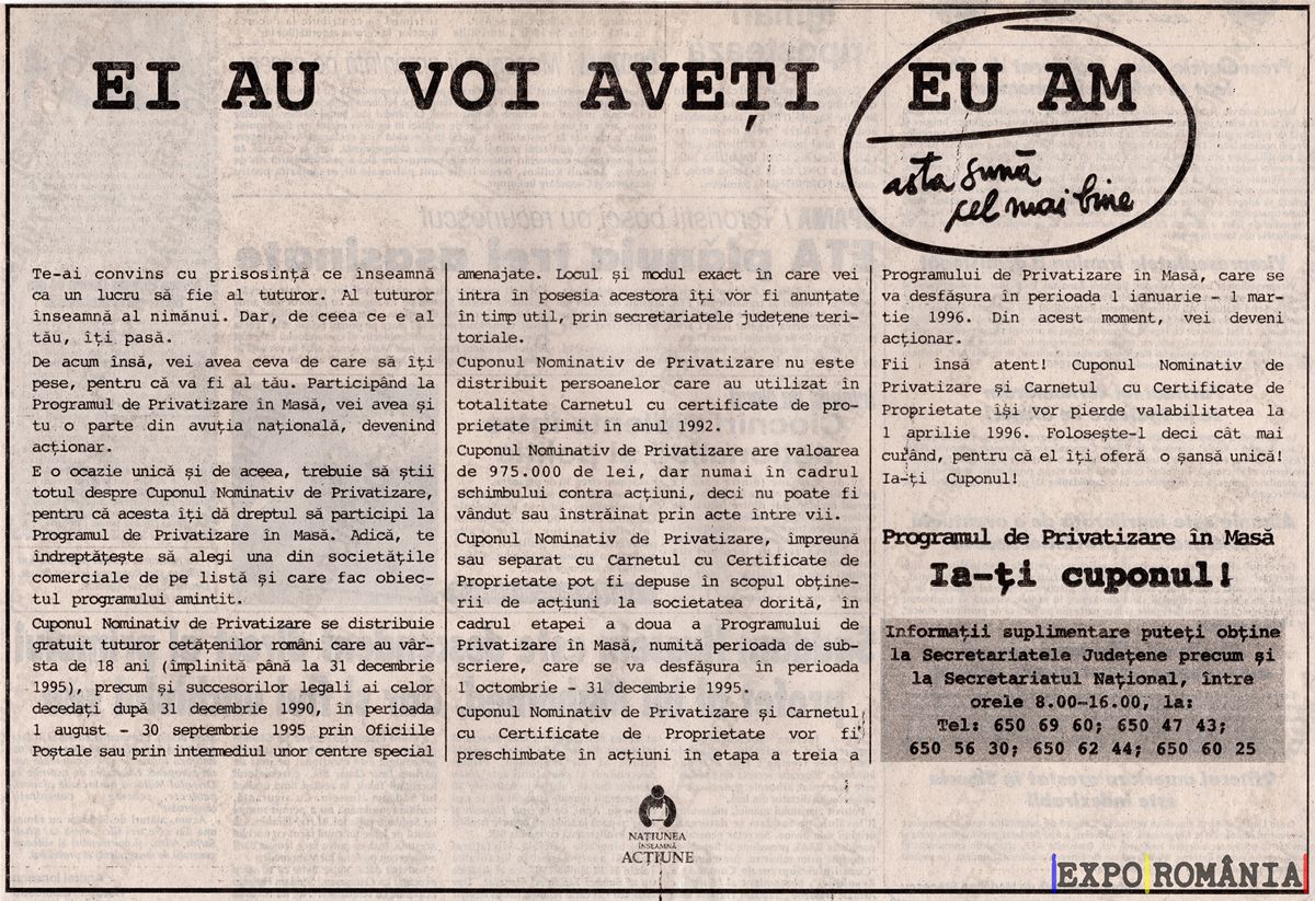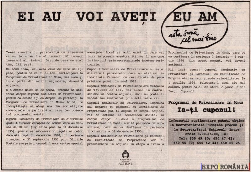 Programul de Privatizare în Masă, care se va desfășura pe parcursul a patru ani și va permite populației să devină acționar în firmele de stat.