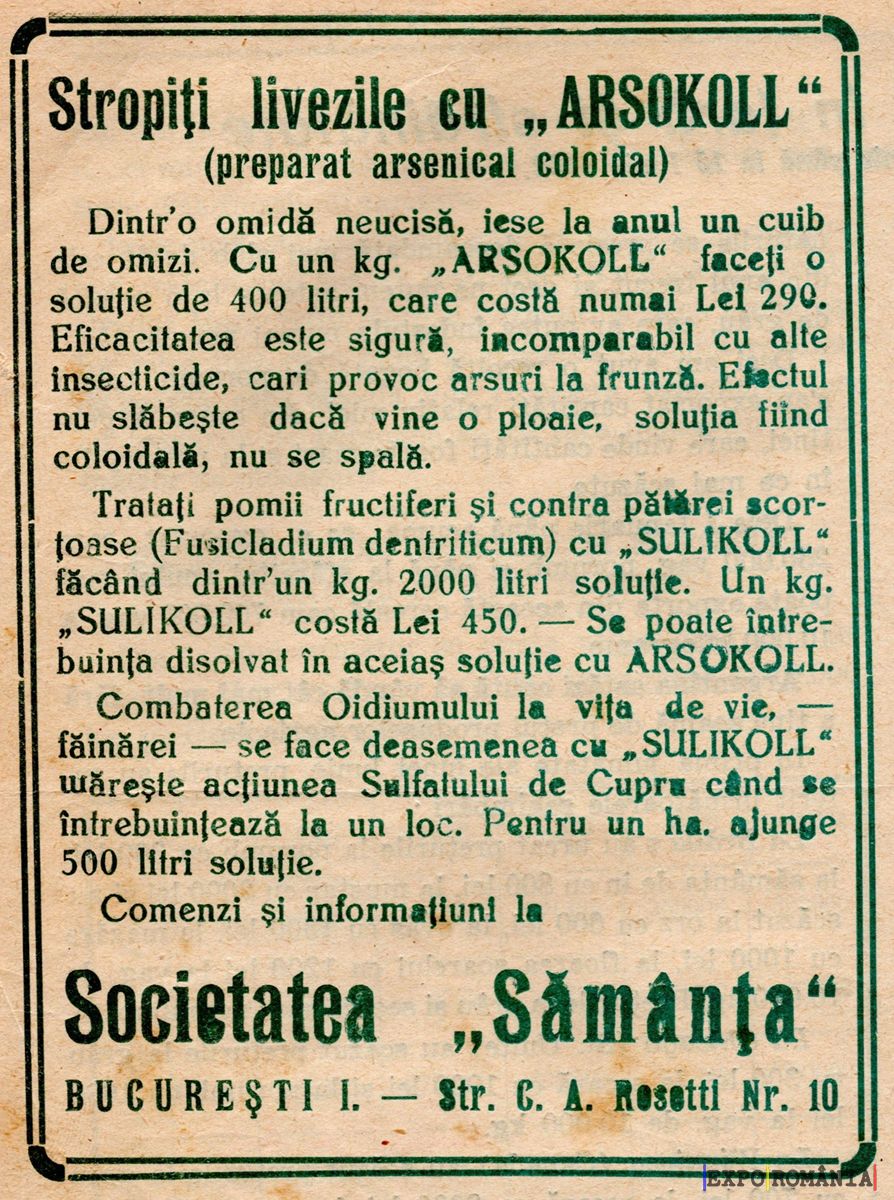 Tratați pomii fructiferi și contra pădurii scorçoase (Fusicaldium dendriticum) cu SULIKOLL“ – fiind la kg. 2000 litri soluție. Un kg. SULIKOLL“ costă Lei 450. Se poate introduce în amestec și această soluție cu ARSOKOLL.