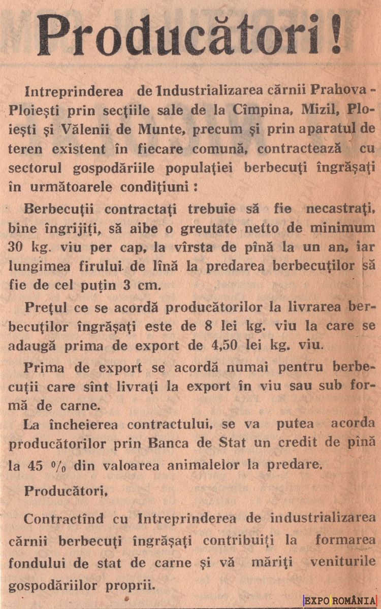 Interprinderea de Industrializarea cărnii Prahova-Ploiești prin secțiile sale de la Cimpina, Mizil, Ploiești și Valea de Munte, preconizează prin aparatul de teren existent în fiecare comună, contractează cu sectorul gospodăriilor populației berbecuti îngrășați în următoarele condiții: