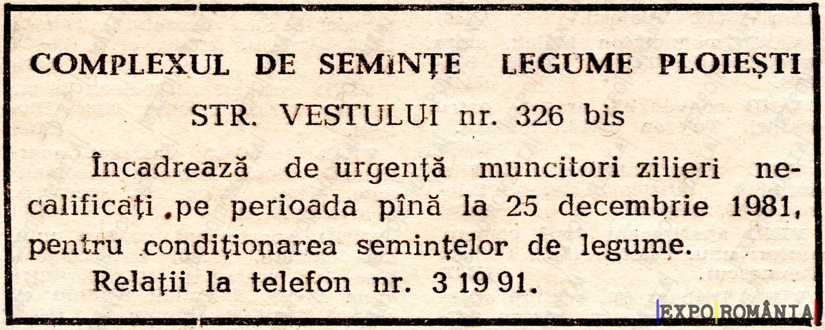 Încadrează de urgentă muncitori zilieri necalificați, pe perioada până la 25 decembrie 1981, pentru condiționarea semințelor de legume.