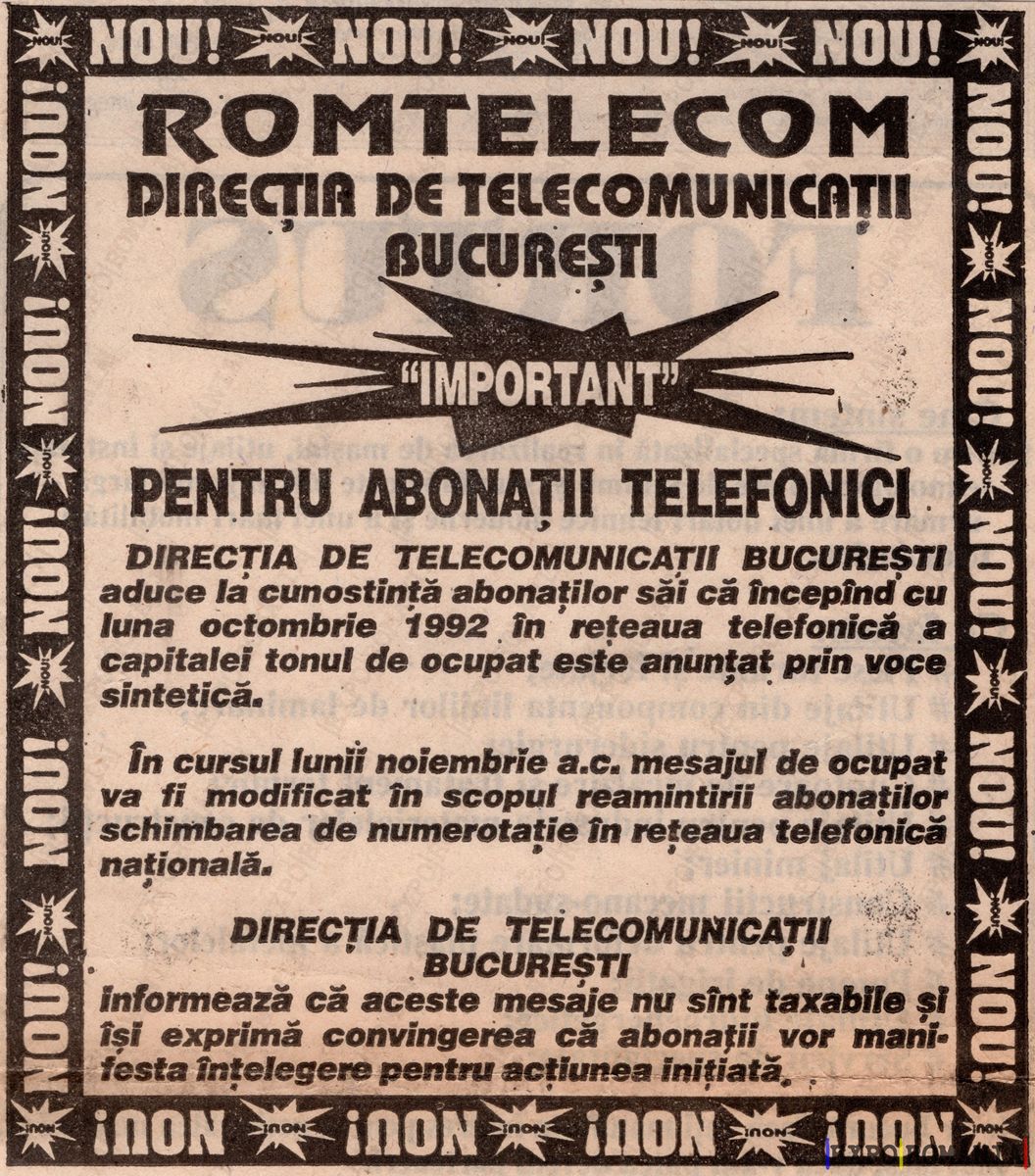 aduce la cunoștința abonaților săi că începând cu luna octombrie 1992 în rețeaua telefonică a capitalei tonul de ocupat este anunțat prin voce sintetică.