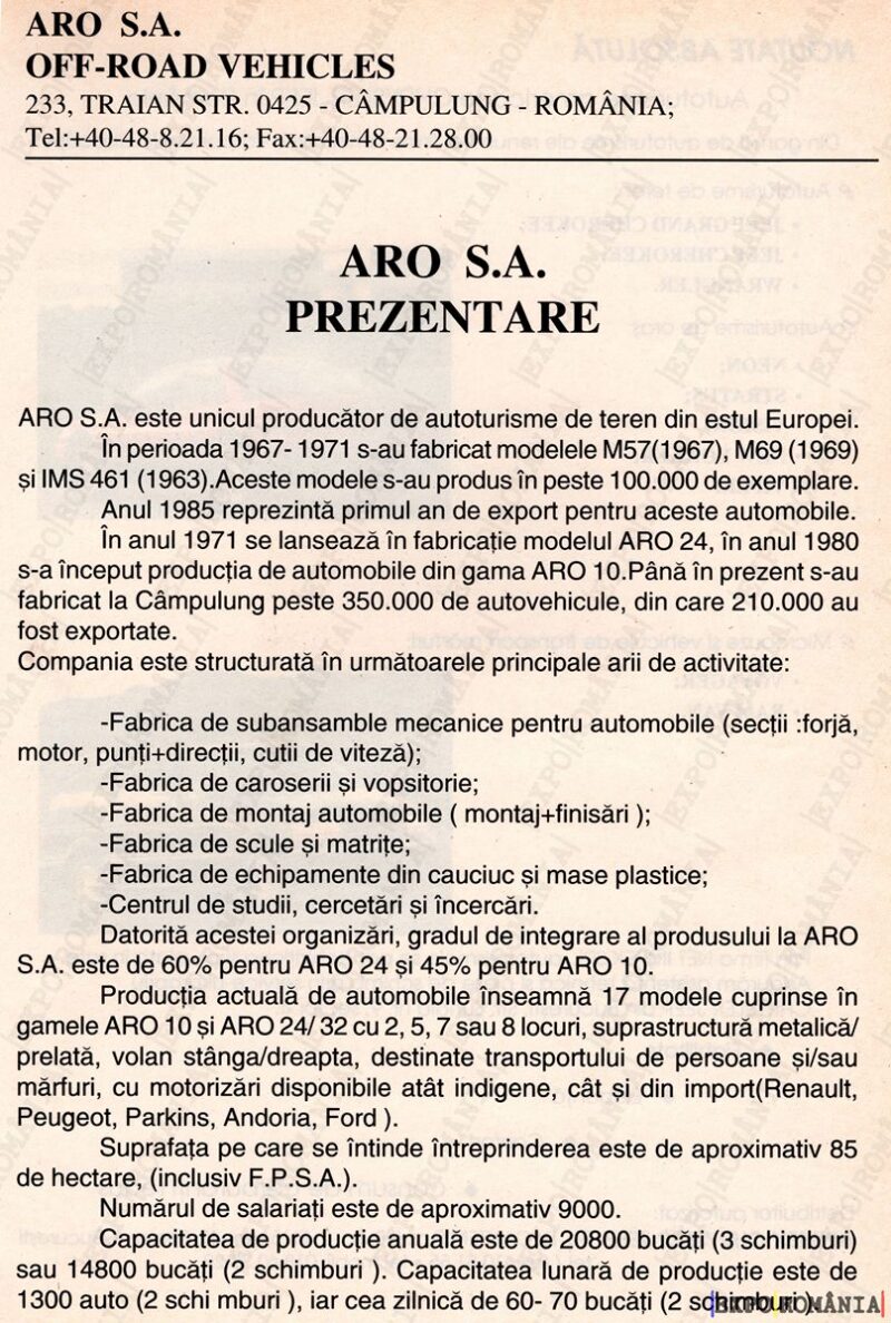 Produsele ARO se vând pe piața internă și externă în 2000 de exemplare pe an, din care 14800 cu dotări specificate, iar masa este cuprinsă între 1300 și