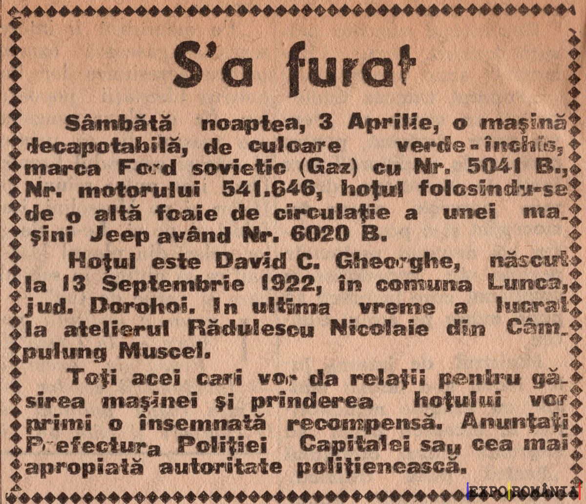 Sâmbătă noaptea, 3 Aprilie, o mașină decapotabilă, de culoare verde închis, marca Ford sovietic (Gaz) cu Nr. 5044 B, Nr. motorului 541.646, hoțul folosindu-se de o altă foaie de circulație a unei mașini Jeep având Nr. 6020 B.