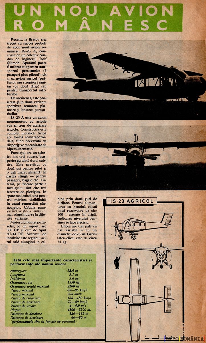Rezultatul în Biroul de proiectare RA-1, în frunte cu inginerul șef ing. Mihai Bârsănescu, este acest nou avion agricol IS-23. Proiectat pentru a îmbunătăți condițiile de lucru ale agriculturii, IS-23 aduce inovații semnificative în domeniul aviației agricole.