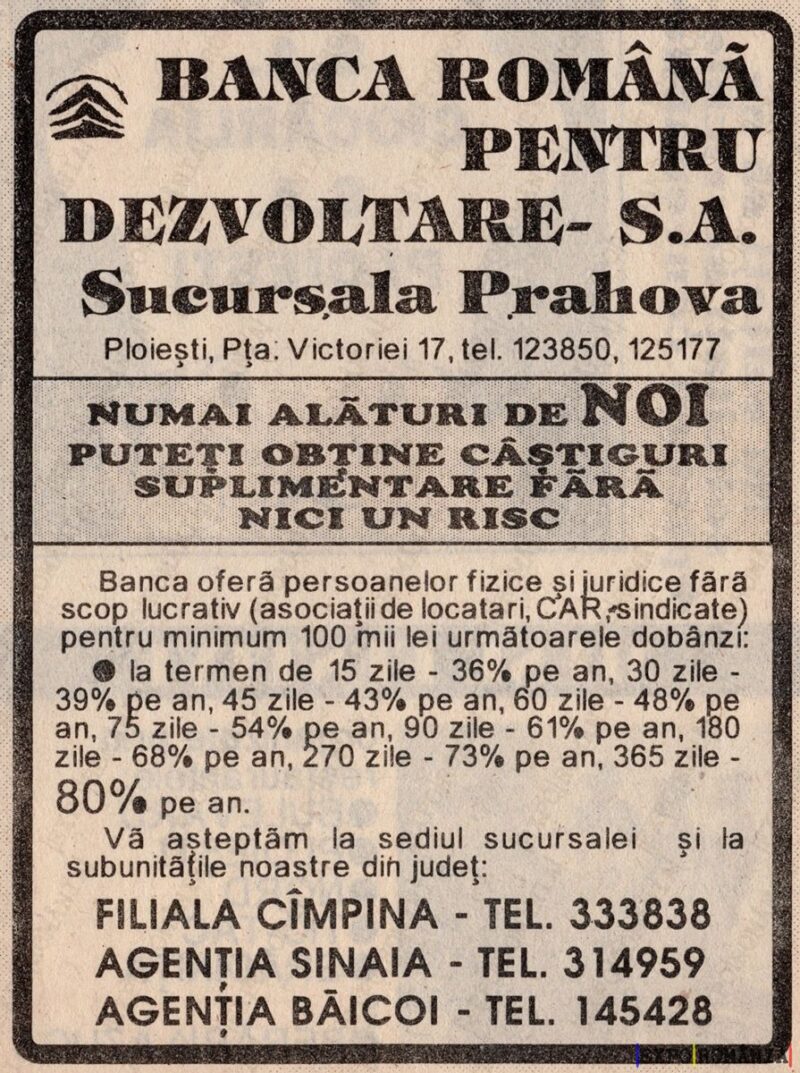 Banca oferă persoanelor fizice și juridice fără scop lucrativ (asociații de locatari, CAR-uri, sindicate) pretențiunii minime 100 lei min la următoarele dobânzi: