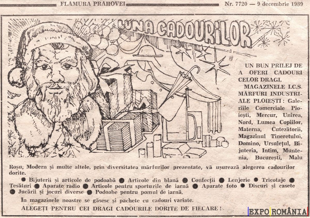 UN BUN PRILEJ DE A OFERI CADOURI CELOR DRAGI MAGAZINELE I.C.S. MARFURI INDUSTRIALE PLOIEȘTI: Galeriile Comerciale, Ploiești, Mercur, Unirea, Nord, Lumea Copiilor, Matern, Călțătorii, Mărturii, Domino, Trusălit, Bujoreanu, București, Malu.