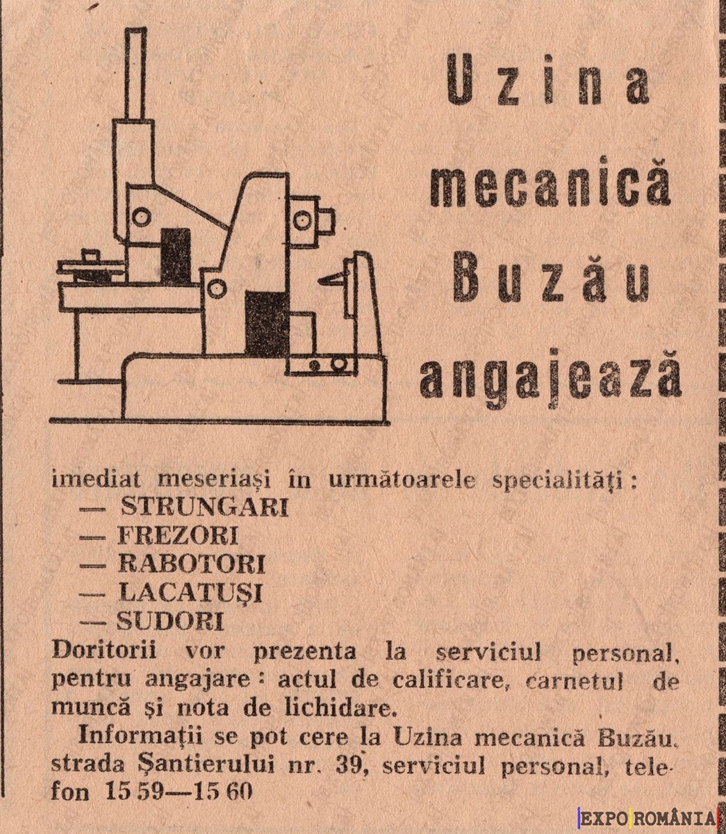 Informații se pot cere la Uzina mecanică Buzău, strada Șantierului nr. 39, telefon 1559—1560