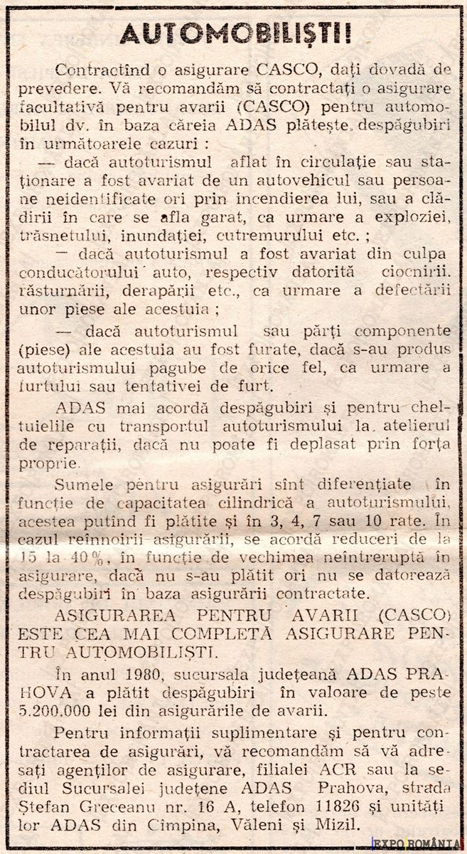 În anul 1980, asociația judeteană ADAS prahovă a încheiat 1826 de contracte și a plătit 5.200.000 de lei în despăgubiri de avarii.